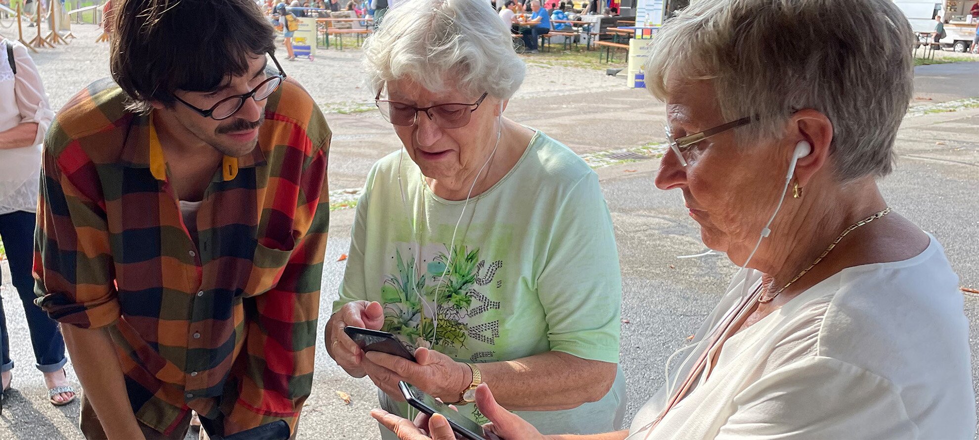 Über eine Augmented-Reality-App begeben sich Besucher:innen auf eine interaktive Zeitreise, entdecken historische Spuren, hören Stimmen von Zeitzeug:innen und gestalten selbst ein wachsendes digitales Kunstwerk.