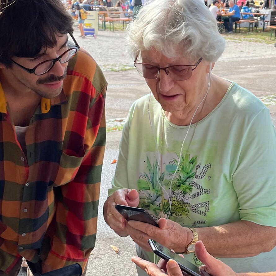 Über eine Augmented-Reality-App begeben sich Besucher:innen auf eine interaktive Zeitreise, entdecken historische Spuren, hören Stimmen von Zeitzeug:innen und gestalten selbst ein wachsendes digitales Kunstwerk.